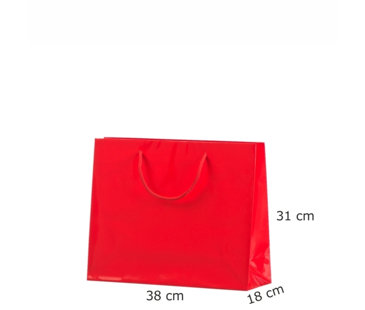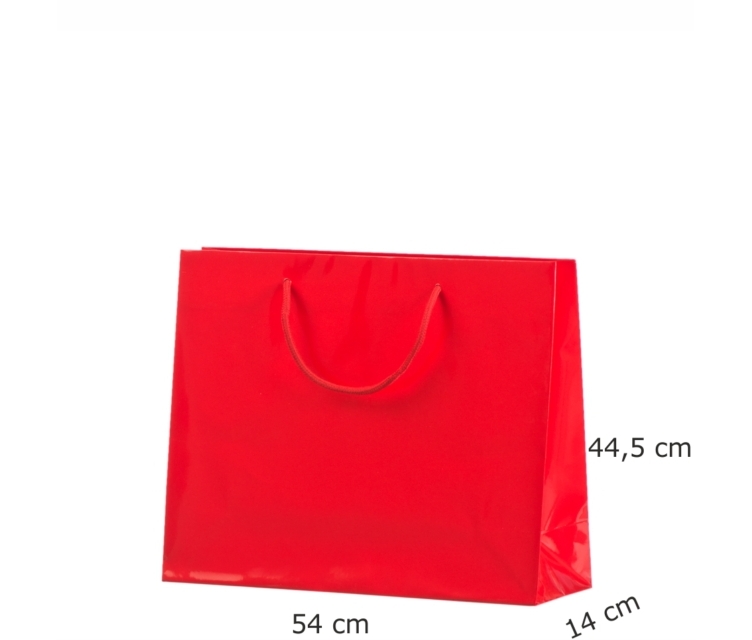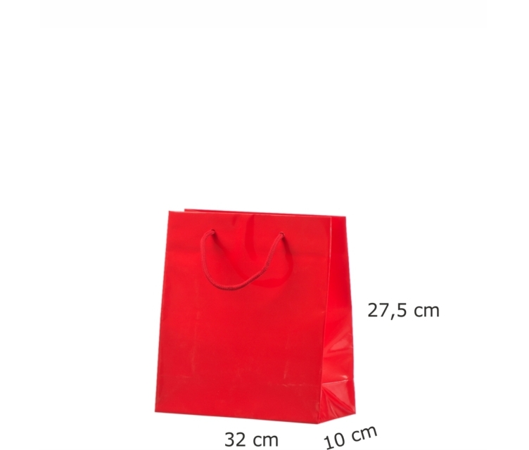 Punaiset puuvillanarusta tehdyt kannikkeet. Valikoimamme sisältää 6 eri kokoa punaisia kirkaslaminoituja paperikasseja