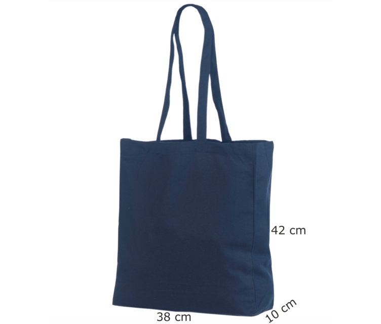 Etsitkö tyylikästä ja käytännöllistä tummansinistä kangaskassia leveällä pohjalla? Premiumvalikoimamme on tehty vastaamaan täydellisesti tarpeisiinne. Tämä tummansininen leveällä pohjalla varustettu kangaskassi omaa tummansiniset pitkät puuvillahihnat, joten sitä on helppo kantaa olkapäällä. Tukevasta 220 gramman puuvillasta tehdyn kassin kestävyys on vailla vertaa, ja 38 x 10 x 42 cm koko tarjoaa runsaasti tilaa kaikelle tarvittavalle.