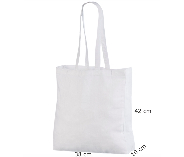 Valkoinen kangaskassi leveällä pohjalla valmistetaan 220 g puuvillasta. Kassin kahvat ovat pitkät, joten kassia on mukava kantaa olkapäällä.