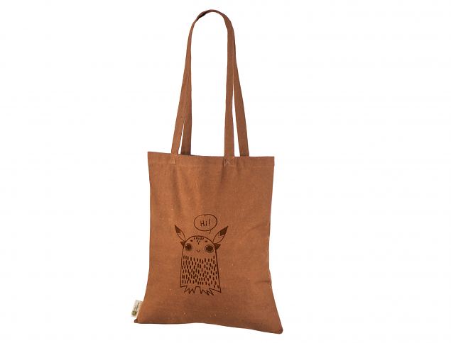 Rooste värvi ümbertöödeldud puuvillast kotid, millel pikad sangad. Trükiga kottide miinumum kogus