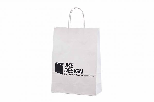 Stark, högklassig vit papperskasse. Gratis frakt till Sverige ingår. Kan fås med eller utan personligt tryck.