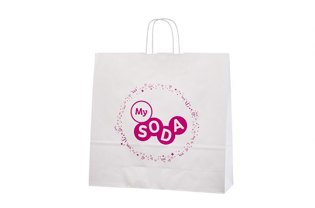 Valget värvi paberkott on toodetud vastupidavast ja kvalitee. . | Fotogalerii- valged paberkotid, millele trükitud klientide logod