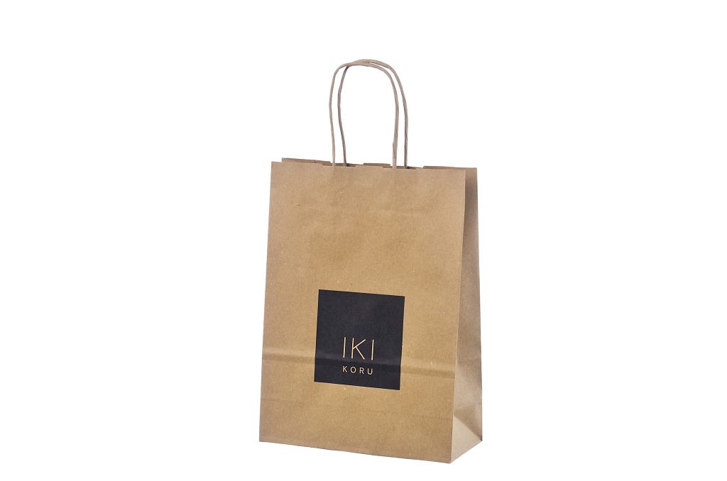 ekologisk papperskasse med tvinnade handtag och logotyptryck